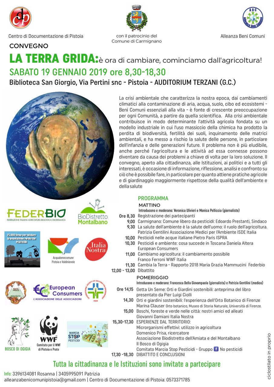Sabato 19 gennaio, dalle ore 8.30 alle ore 18.30, si terrà a Pistoia il Convegno “La Terra grida: è ora di cambiare, cominciamo dall’agricoltura!”.